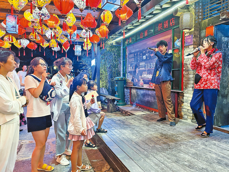 近日,柞水终南山寨通过引入音乐、潮玩、美食、非遗等特色元素,不断丰富消费新“夜”态,点亮夏日“夜经济”。图为8月12日晚,终南山寨的山歌对唱节目吸引来大量游客的参与互动。 (本报记者 肖 云 摄)
