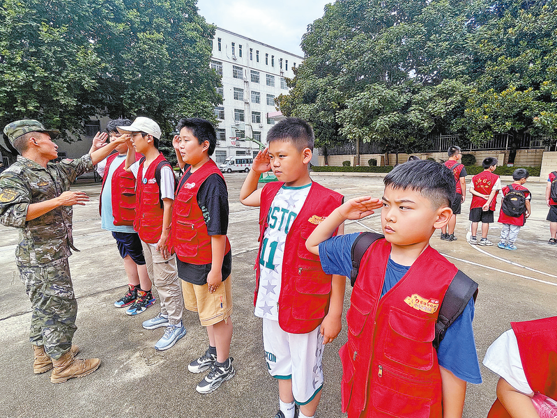 “大家仔细看一下,这面墙上是我国的英模典型人物,他们的光荣事迹值得我们每个人去学习。”英模墙上,一个个小展板记录了集体荣誉、重大任务、英模典型、岗位实践等内容,武警官兵一一为小记者讲述英模人物的英勇事迹。“咚咚咚……”随着鼓声响起,小记者最期待的“一队一品”节目《战鼓催征》正式开演,多名武警官兵手拿鼓槌有节奏地敲击鼓面,鼓槌上下飞舞,气势磅礴,鼓声激越豪迈,看得大家热血沸腾,掌声不断。随后,小记者观看了战士日常训练,并分组体验军事训练。“敬礼的时候注意手掌的位置,手掌不要蜷缩着,礼毕时,手掌动作从胸 前自然滑落。”烈日下,武警官兵带领小记者进行集合和队列训练,认真指导大家每个动作要领。