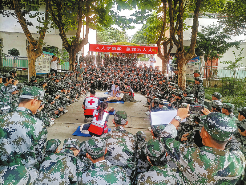 8月10日,商南县红十字会联合县人民医院,为县高级职业中学高一年级320名参加军训的学生进行应急救护技能培训,普及应急救护知识。(本报通讯员 徐飞鹏 摄)