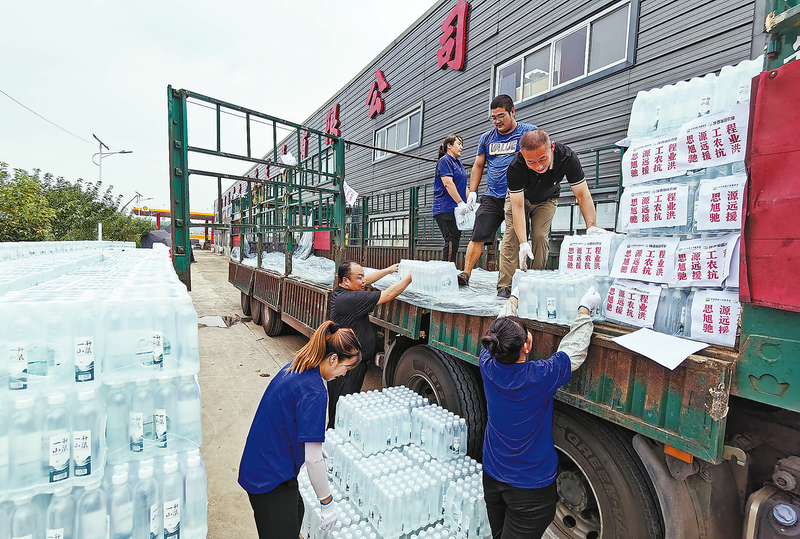 8月11日,位于丹凤县的陕西旭远农业科技发展有限公司向“思源工程”捐赠2368箱矿泉水,助力黑龙江省牡丹江市防汛救灾工作。 (本报记者 杨 鑫 摄)