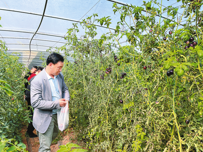 近年来,洛南县三要镇北司村利用太阳能光伏发电板下闲置土地,大力发展蔬菜种植产业,同时引进多个圣女果新品种,目前已建成蔬菜大棚65个,带动附近30多名群众就业增收。图为游客在大棚采摘圣女果。 (本报记者 张 英 摄)