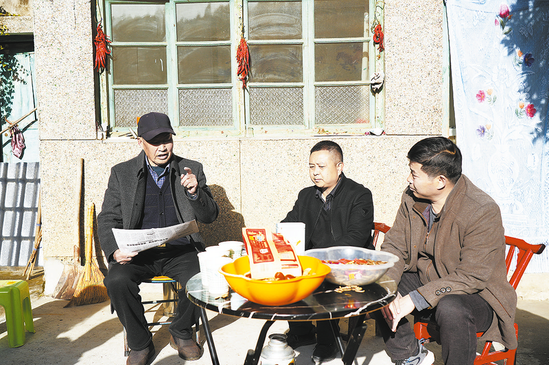 12月7日,王成军(左一)与群众分享学习心得。“从教近40年,现在退休了,坐在自家院里讲讲党的好政策,发挥教师特长,为社会发挥余热,感觉自己还有价值,生活也充实!”11月27日,丹凤县竹林关镇南院村第四期“乡音党课”结束后,83岁的老党员王成军讲完课后感慨道。