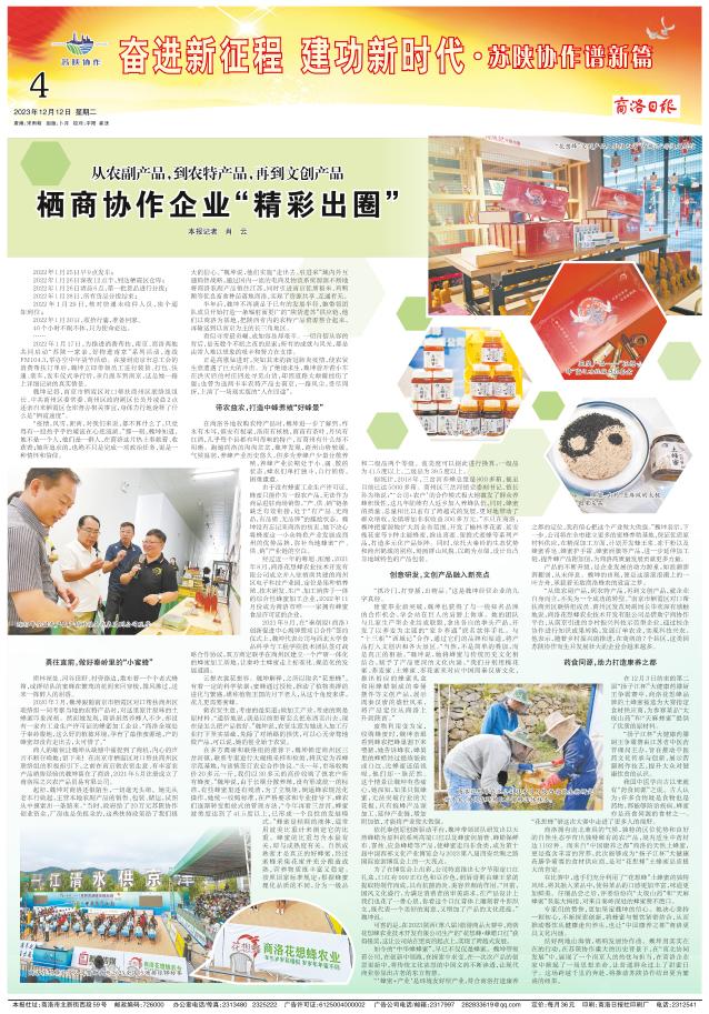 “从做农副产品,到农特产品,再到文创产品,就企业自身而言,不失为一个成功的转型。”南京市栖霞区对口帮扶商州区联络组成员、商州区发改局副局长毕欢深有感触地说,商洛花想蜂农业技术开发有限公司是借助宁商协作平台,从南京引进的乡村振兴科技示范型企业,通过校企协作进行知识成果转换,发展订单农业,实现科技兴农。他表示,随着乡村振兴的推进,在商洛的7个县区,这类因苏陕协作而生并发展壮大的企业会越来越多。
