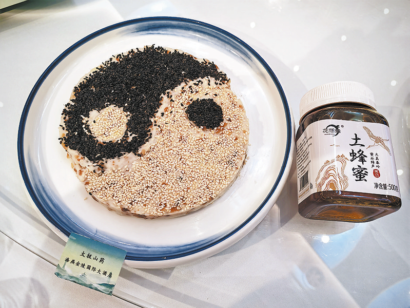 蜂蜜、山药、芝麻做的太极图案菜品。