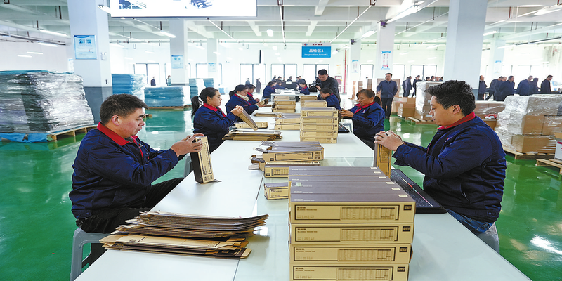 12月2日,新入驻商南县新材料产业园的陕西泓宇新材料有限公司包装车间内,工人正在包装各式各样的鼠标垫。