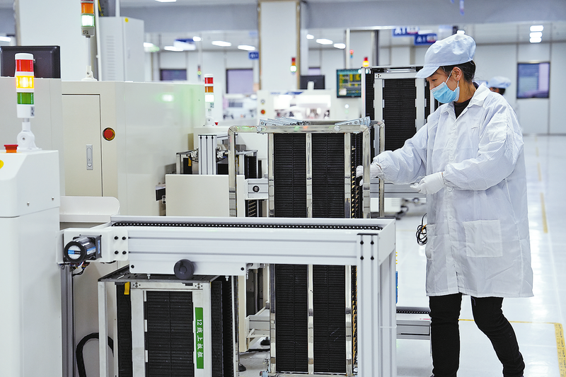12月1日,在陕西普阳时代电源有限公司,工作人员正在检查工业电源线路板质量。