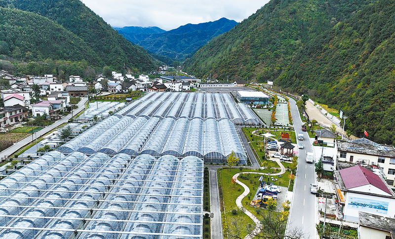 金米村全景。目前,金米村已拥有170座木耳大棚,种植规模达到500万袋。
