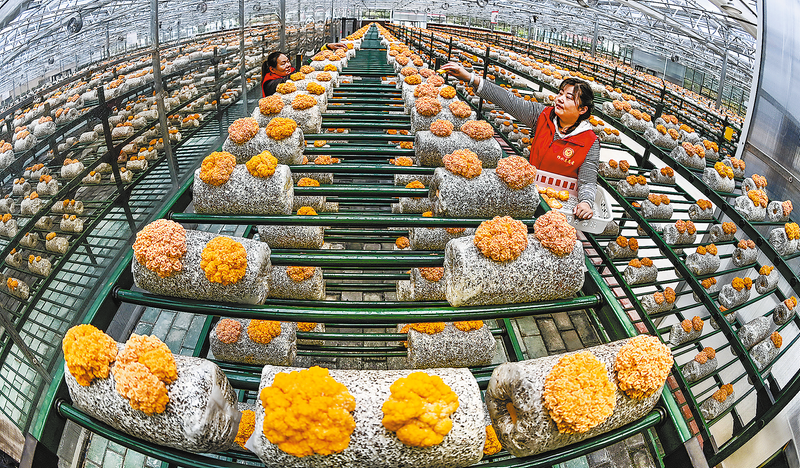 金米村村民在金米智慧农业产业园采摘金木耳。今年开始种植的金木耳,第一茬10万袋、秋季6万袋。