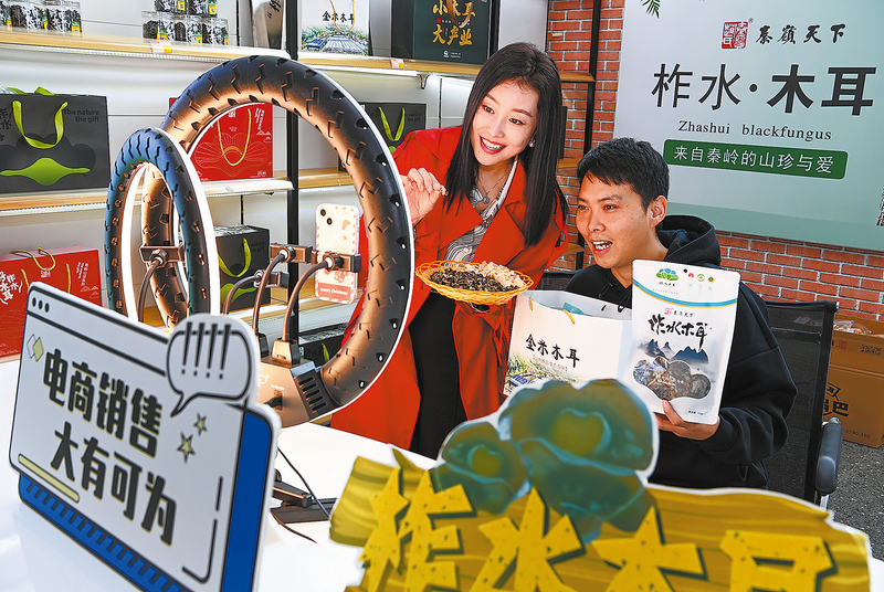 柞水县融媒体中心主播谢丹(左)、许宗华在金米村直播,助力乡村振兴。