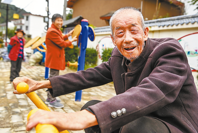 80岁的王治珊老人在金米村健身广场锻炼。乡村产业的发展让村民收入稳中有升。说到今天的幸福生活,王治珊老人高兴得合不拢嘴。