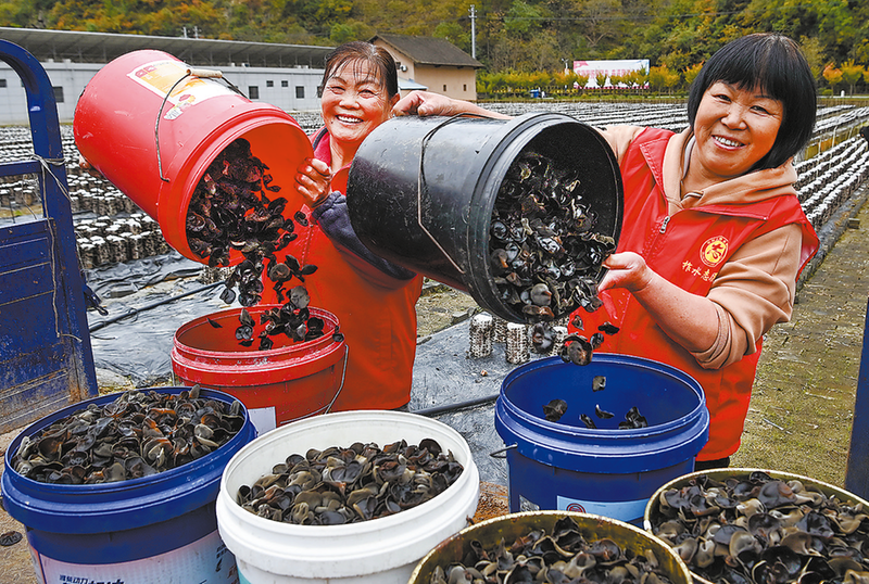 初冬时节,柞水县小岭镇金米村金米智慧农业产业园内,村民正忙碌地采摘金木耳。今年开始种植的金木耳,第一茬10万袋和秋季6万袋,均获得了好的收成。