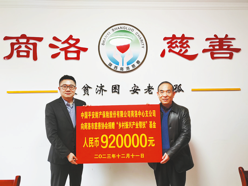 △12月11日,中国平安财产保险股份有限公司商洛中心支公司向市慈善协会捐赠“乡村振兴产业帮扶”基金92万元。多年来,该公司立足于当地农业产业风险保障需求,积极探索各类保险升级服务,持续助力乡村振兴。 (本报通讯员 万泉山 摄)