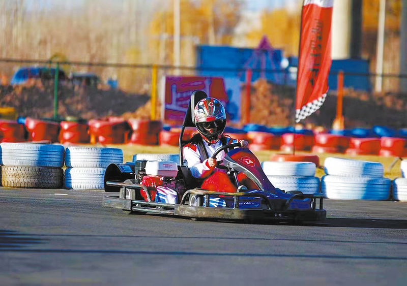 11月15日,孩子在秋沙鸭亲子乐园内玩卡丁车。