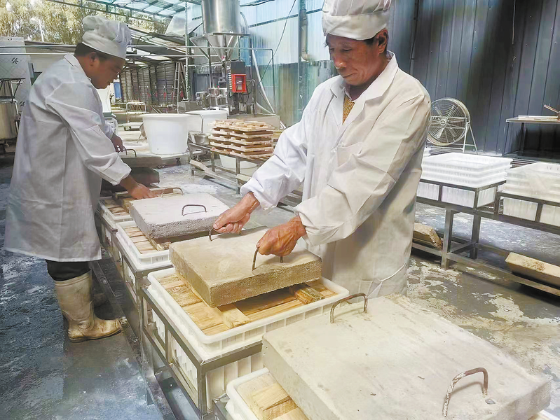 11月15日,在洛南县洛水泉豆制品合作社内,工人在制作豆腐。