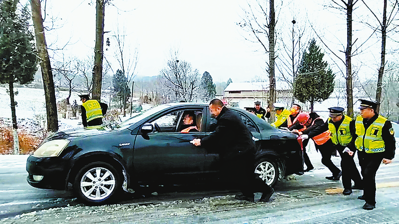 12月14日,我市部分地区出现极端雨雪天气,有关部门积极应对,全力保障群众出行安全。图为344国道鸭雀岭附近上坡车辆打滑,洛南县古城中队民警和路政部门工作人员合力帮忙推车。 (本报通讯员 周 洁 摄)