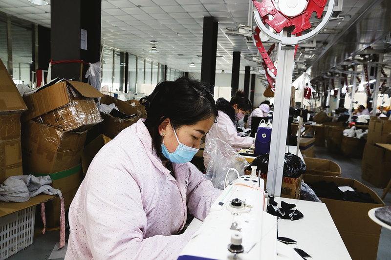 12月7日,在位于柞水县小岭镇黄金移民安置小区的苏陕协作商洛玛威尔琦服装有限公司社区工厂,工人正在生产羽绒服。该厂安置40多名周边群众进厂就业,从事服装生产等工作,使他们在家门口实现稳定就业。