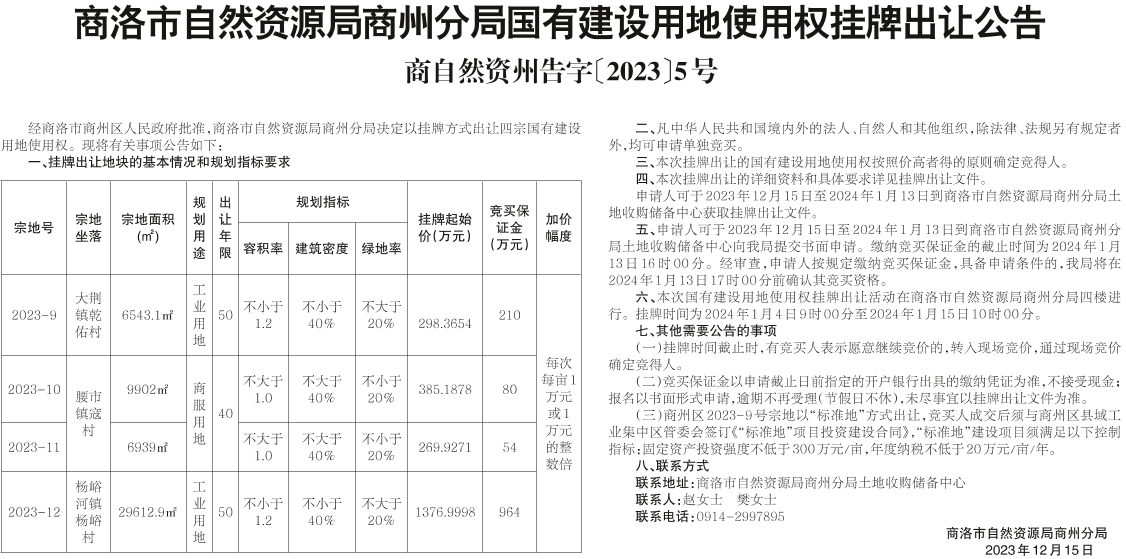 商洛市自然资源局商州分局国有建设用地使用权挂牌出让公告
