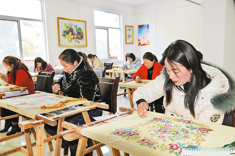 十二月七日,镇安县美云秦绣工艺品有限公司的社区工厂内,二十多名绣娘正在进行手工刺绣。该公司依托镇安刺绣这一省级非物质文化遗产保护项目,打造出美云秦绣品牌,辐射带动柞水、丹凤、商南等地的群众参与进来,年产值可达八百多万元。(本报记者 刘桃李 摄)
