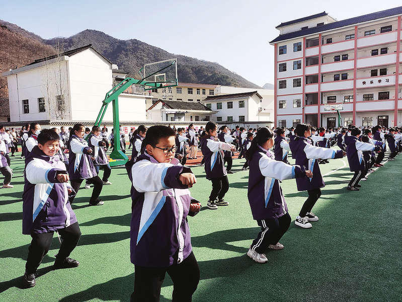 12月6日上午,镇安县云盖寺镇第二小学操场上,伴着音乐节奏,学生们沐浴着阳光,做起了武术操。据了解,镇安各校将太极拳、武术、踢毽子等运动项目作为特色大课间活动内容,在帮助学生强身健体中,也丰富了校园生活。 (本报记者 马泽平 摄)
