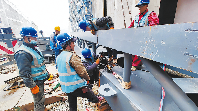 工人正在吊装巨型钢构装置12月11日,气温骤降,寒气袭人。在秦岭博物馆项目施工现场,50多米高的大型吊车旁,10多名工人正在进行博物馆中厅巨型钢结构的吊装。