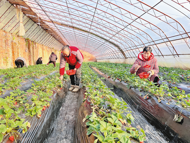 商州区麻街镇中流村仙湖生态农业休闲园的草莓目前进入采摘期,该园区以种植水杂果为主,带动周边4个村60多人就近务工增收。图为12月19日,园区工人正在大棚内采摘草莓。 (本报记者 谢 非 摄)