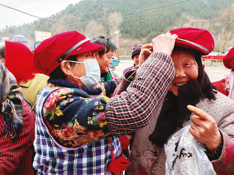 12月13日,商洛市级社会组织联合山阳县新时代文明实践中心志愿者,将由西安爱心企业捐赠的150套保暖帽送到了山阳县色河铺镇夏家村村民手中。 (本报记者 王孝竹 摄)