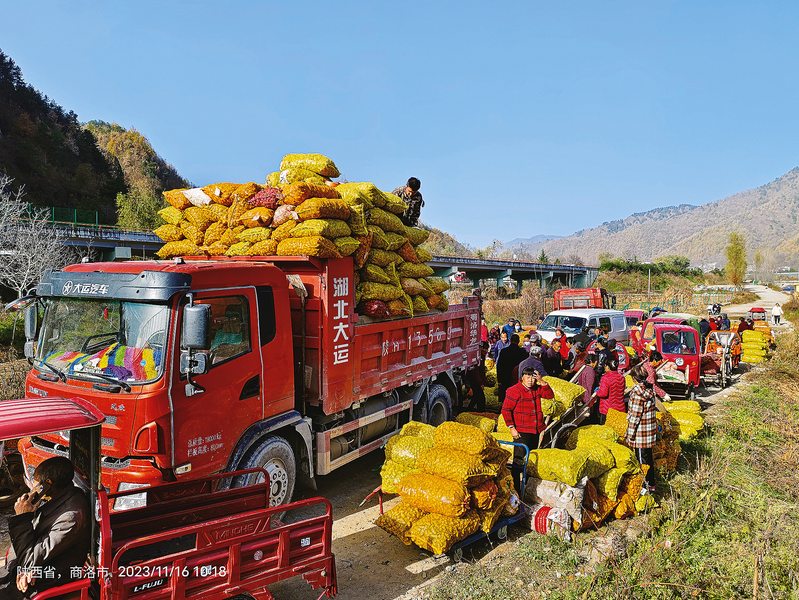 12月14日,在陕西森弗天然制品有限公司大门前的路边,有序地停靠着长长的车队,只见大货车、小货车、农用车、小型三轮车上装满菊芋,有的车上因码得太高,还用绳索捆了好几圈,三三两两的农户在路边等待收购,不时凑在一起拉家常。
