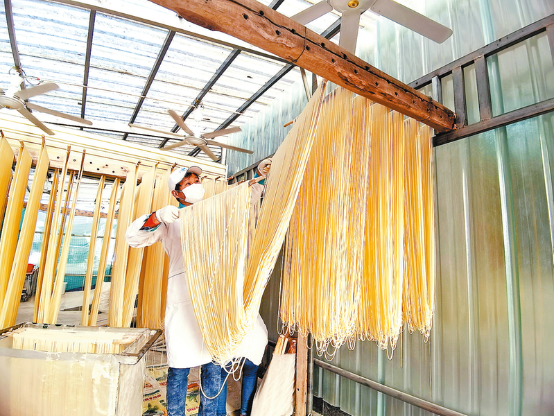 在冯新瑞家不远处,49岁的刘金莲正拿着初步拉好的挂面到院子进行晾晒。“我和老公从事这项事业有10多年了,从开始4天只能出60斤挂面,到现在每天能出120斤,去年4个月的收入就有4万元呢。”刘金莲说。
