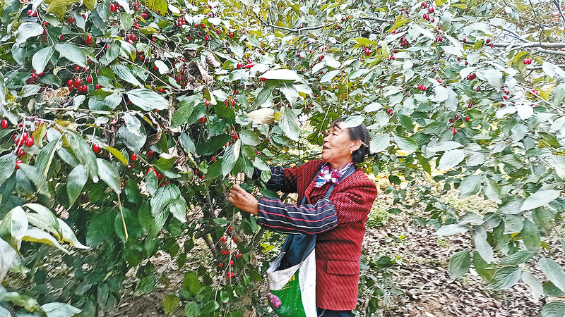 2023年10月,赵塬村村民彭秀芳在自家地里摘山茱萸。当年她家靠山茱萸能收入2.6万元。