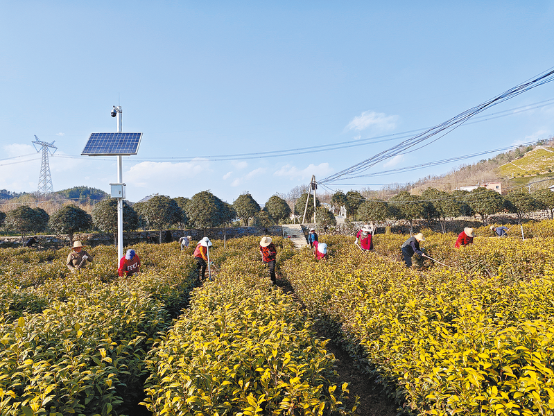 3月11日,在商南县试马镇郭家垭村商南县沁园春茶叶基地,60多名 群众正在为黄茶和龙井除草。 (本报通讯员 万小丹 摄)
