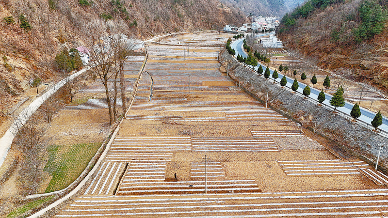3月8日,商州区麻街镇一行行种植好的土豆覆盖着地膜,如同一条条白色绸带,在大地上绘出横竖错综的线条。