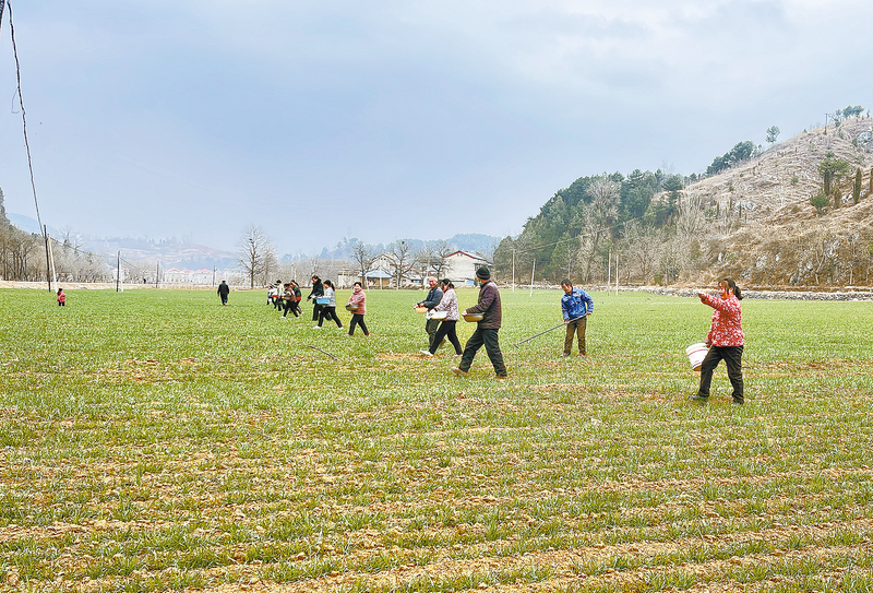 2月下旬以来,正值冬小麦科学管理的关键时刻,洛南县麻坪镇农技 干部深入娘庙村百亩小麦种植示范园,落实追肥、病虫草害防治等科管措 施,全力做好春季管理工作。 (本报通讯员 杨皓辰 摄)一年之计在于春。惊蛰一过,气温回升,雨水增多,商洛大地进入春耕时期。大山里,冰雪虽然还未完全消融,但田地里早已处处都是繁忙的劳动场景。连日来,记者深入商州、丹凤、洛南等地蹲点采访,拍摄到了一幅幅春耕图。