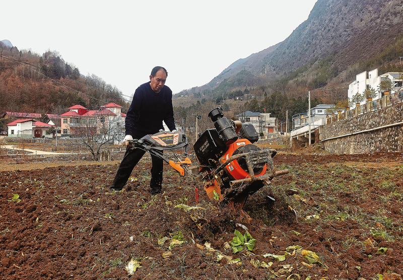 3月7日,山阳县天竺山镇三槐村村民朱财全正在用旋耕机耕地。据朱财全介绍,过去耕这块地需要20名劳力辛苦1天,现在用机器只要2小时。 (本报通讯员 高军军 摄)