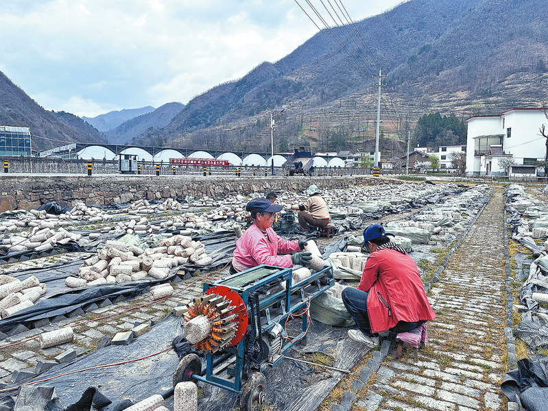 三月二十七日,在柞水县金米村木耳产业基地里,村民正在忙着给木耳菌棒打孔。近年来,金米村累计扩建木耳大棚一百七十座,发展木耳一千七百万袋,户均增收一点五万元,真正把“小木耳”做成群众致富增收的“大产业”。(本报记者 杨 萌 摄)