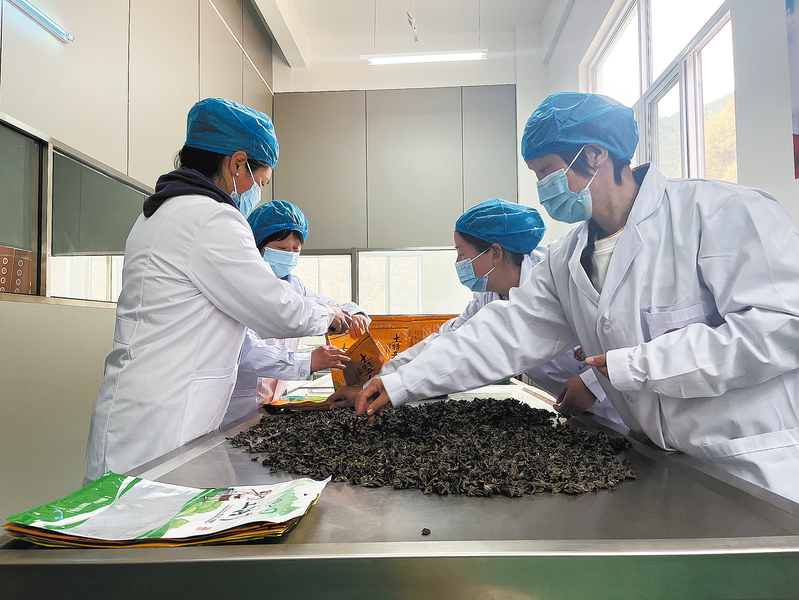 4月7日,柞水县红岩寺镇本地湾村农产品分拣包装厂内,工人正在对木耳进行包装。该厂以电商平台直播模式,销售当地的核桃油、香菇、木耳、蜂蜜等农副产品,带动群众增收。 (本报记者 马泽平 摄)