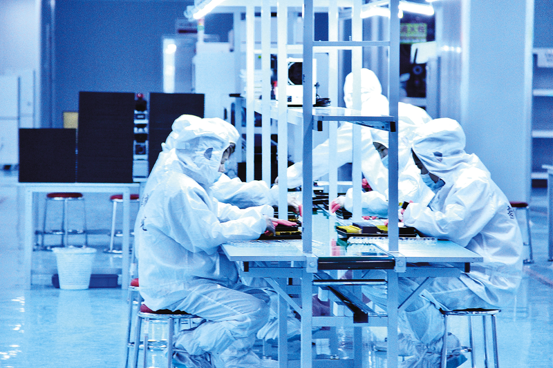 4月24日,在商洛新维视电子科技有限公司,工人正在组装新生产的电子显示屏。据了解,该公司采用国际领先的LTPS与IPS工艺技术,生产液晶屏模组、背光源及指纹模组,可实现年产2000万片液晶模组及FOG部件产品,产值5亿元,提供就业岗位200个。 (本报记者 王江波 摄)
