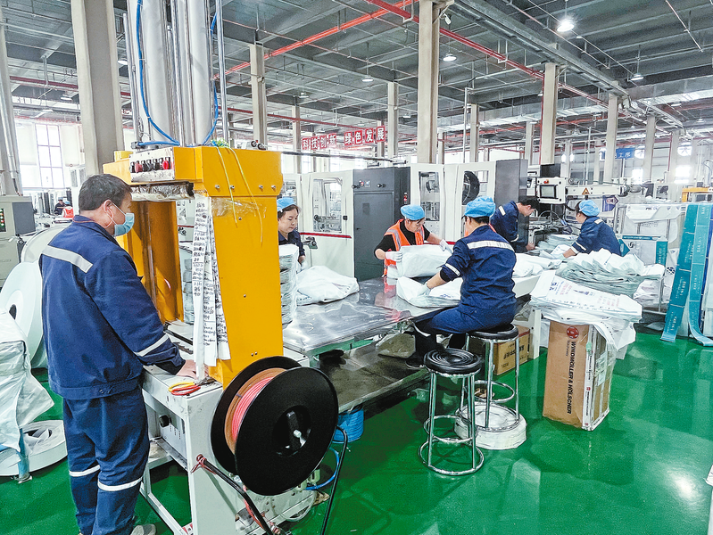 4月24日,在陕西柏宏欧利塑业有限公司生产车间,员工正在忙碌生产。据了解,该公司践行绿色低碳理念,产品原材料主要来源于工业副产品,年节能折合标准煤1300吨、减少二氧化碳排放1万吨,能耗较传统工艺降低30%。目前,该公司所生产的环保水泥袋产品已经远销哈萨克斯坦、赞比亚、莫桑比克、刚果布等中亚和非洲国家。(本报记者 王天彤 摄)