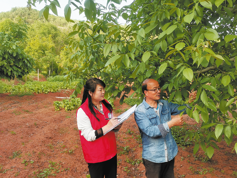 4月24日,丹凤县气象服务人员来到商镇张村核桃种植基地了解气象服务需求。据了解,丹凤县气象局常年加强天气监测预报,通过手机短信、微信公众号等及时发布预报预警信息,提醒种植户做好果树管理,防范灾害性天气对核桃产量的影响。 (本报记者 巩琳璐 摄)