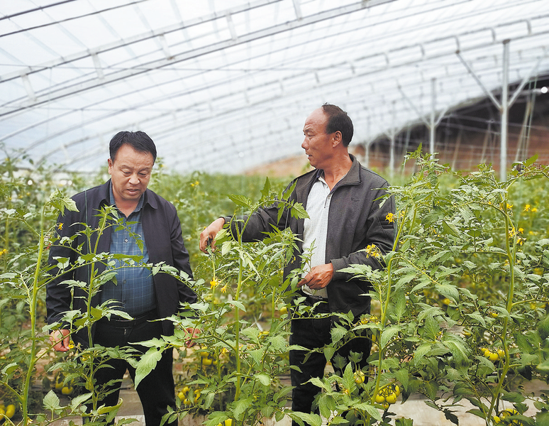 4月16日,在洛南县四晧街道中心村蔬菜大棚里,村上外聘技术人员正在指导村干部进行掐尖、打芽作业。该村坚持党建领航、党员引领,打造商州和洛南的“菜篮子”,共发展村集体经济蔬菜大棚120个,村集体经济年纯收入30万元,带动50多名群众常年在蔬菜产业基地务工增收。