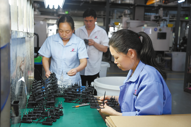 4月26日,在山阳县电子信息产业园金阳精密模具有限公司的生产车间里,工人们正在组装电源适配器活动脚。金阳精密模具制造是目前陕南地区最先进、最大的模具制造基地。公司专注于塑胶模具的设计与制造、精密塑胶零件的生产,是5G电源适配器全产业链的配套项目,日均产能可达20万套,满足20条电源生产线的需求。 (本报记者 米子扬 摄)