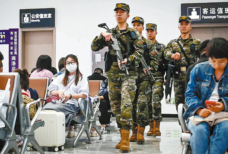 “五一”假期,担负城市武装巡逻任务的武警商洛支队官兵以车巡、步巡和定点警戒相结合的方式,分组分时段对车站、商场、景区等周边人员密集场所进行全方位、多层次巡逻防控,为旅客平安顺利出行保驾护航。