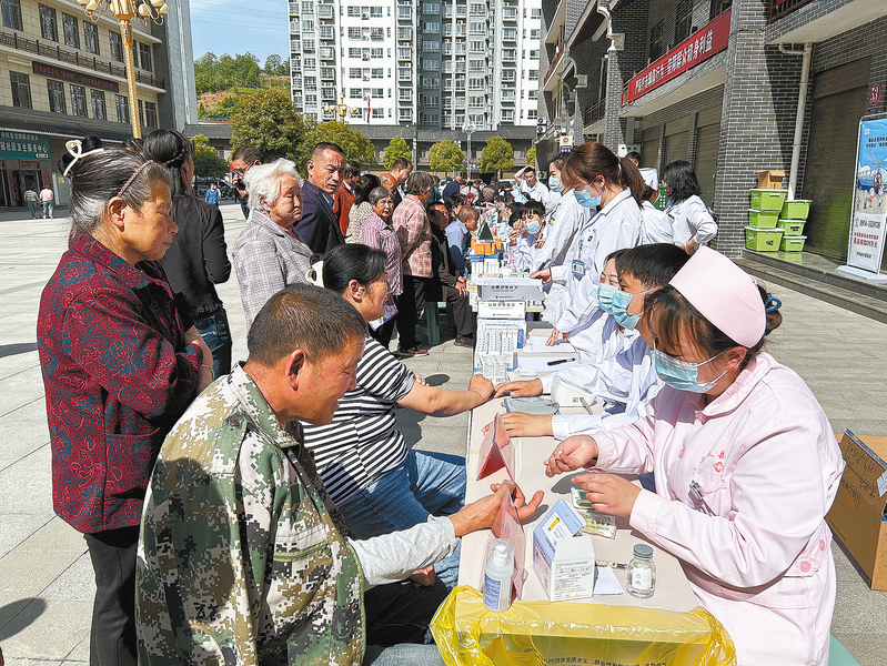 4月25日,丹凤县医院、县中医医院、县妇计中心、江南医院、博爱医院等在丹凤县凤冠新城电影广场开展义诊活动,现场为群众提供测量血压、血糖和健康咨询等义诊服务,免费为群众发放药品。