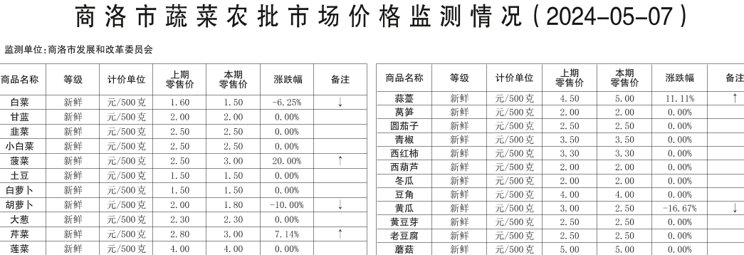 商洛市蔬菜农批市场价格监测情况(2024-05-07)
