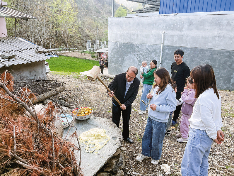 一碗洋芋糍粑,一份浓浓乡愁。4月15日,商州区闫村镇南宽坪村的石碾边,村民正在热火朝天地打洋芋糍粑。只见木锤快速地打落在已经拉丝的洋芋糍粑上,又迅速抽离,一起一落间黏糊糊的洋芋糍粑就被舀进了事先准备好的洋瓷盆里。