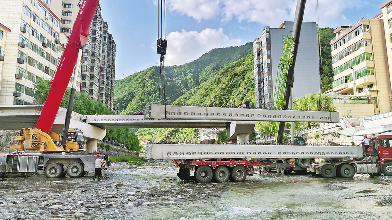 五月十三日,在柞水县城王家沟大桥架梁施工现场,工人正有条不紊地开展工作。据了解,王家沟大桥横跨乾佑河,长约五十四米、宽十二点五米,总投资五百六十四点五一万元,建成后将增加乾佑河东西两岸的通道,方便两岸居民出行。(本报通讯员 詹诗涛 摄)