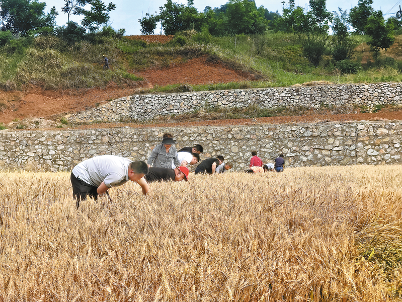 5月12日,商南县湘河镇白浪社区天花沟200多亩集中连片的小麦已经成熟,群众开启“商洛第一镰”的收割。今年 以来,湘河镇对基本农田认真落实“一喷三防”措施,提高夏粮产量,保障粮食安全。 (本报记者 胡 蝶 摄)