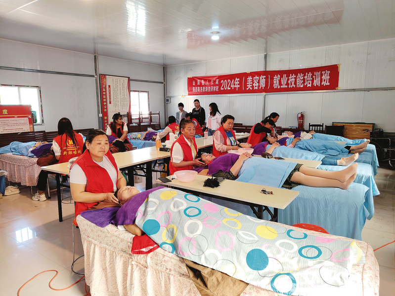 山阳县小河口镇小河街社区在县人社局、小河口镇社保站的组织指导下,联合商洛市新潮学院举办美容师就业技能培训班,免费为辖区有就业创业需求的农村妇女免费提供职业技能培训,切实解决农村妇女就业问题。图为5月14日,山阳县小河口镇社保站工作人员正在辖区小河街社区检查指导美容培训班结业考核。据悉,本次培训班共计20天160学时,培训学员50名。 (本报通讯员 宁 坤 摄)