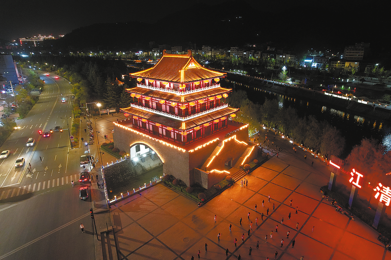 4月15日傍晚,位于丹江河畔的丹鹤楼灯火通明,人们在美丽的灯光中跳广场舞。丹鹤楼古朴的气质与活力四射的现代音乐完美交融。
