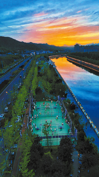 5月11日傍晚,在绚丽的晚霞映照下,滨江银杏公园里气排球比赛在如火如荼地进行中。