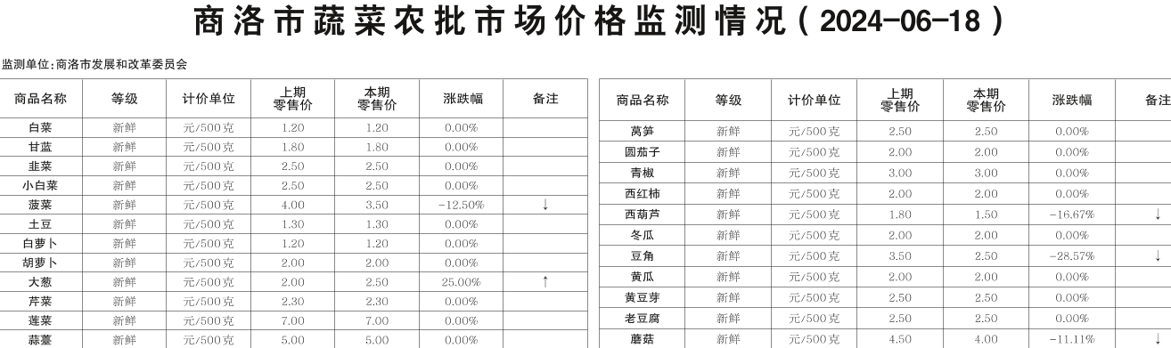 商洛市蔬菜农批市场价格监测情况(2024-06-18)
